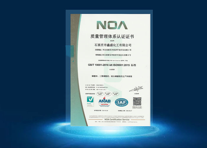 Xin Sheng foi reconhecida como "empresa de alta tecnologia", "Profíncia de Hebei ciência e tecnologia orientada pequenas e médias empresas","Novas empresas especializadas e especiais" e outras empresas avançadas, e desenvolveu 6 novos produtos e 16 novas tecnologias.rica experiência na produção de pigmentos anticorrosivos respeitadores do ambiente, com linha de produção de fosfato profissional, citando reação avançada, secagem, trituração, preenchimento e outros equipamentos, para alcançar a automação de alta tecnologia de equipamentos, produção de inteligentes,Os padrões de fabricação são mais rigorosos., o processo é mais refinado, o desempenho do produto é melhor.3600 toneladas de série de tripolífosfato de alumínio e 1500 toneladas de série de fosfato de alumínioTemos três principais sistemas de certificação (ISO9001, ISO14001, ISO45001), que estão em linha com a certificação da União Europeia REACH registro, requisitos de padrão ROHS, através de testes SGS.Os produtos da nossa empresa são vendidos em todo o país e exportados para o exterior., exportados para o Sudeste Asiático e Europa.